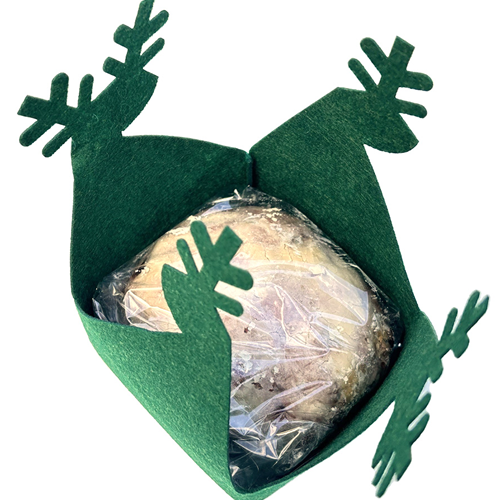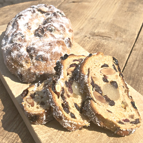 香辛料とともにじっくり漬け込んだドライフルーツと木の実を贅沢に使い、調和した上品な味わいに仕上げました。白い粉糖は、イエスキリストが生まれた日に降っていた雪をあらわしています。(特定原材料等:小麦・卵・乳・アーモンド・オレンジ)